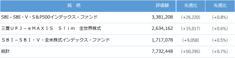 今週は、国内指数は上昇、米国指数は反落する結果になりました。米国長期金利は上昇、為替は円安になっています。保有する国内株、円換算での米国株の株価、投資信託の基準価額が揃って上昇したため、資産は増加し年初来高値を更新しました。