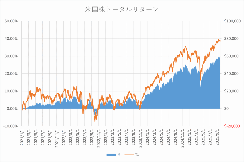 米国株のリターンは先週から上昇しました。現時点のリターンは約$58,719、39.18%になっています。(評価額は下がりましたが、分配金が入金されたため、リターンは上昇しました。)