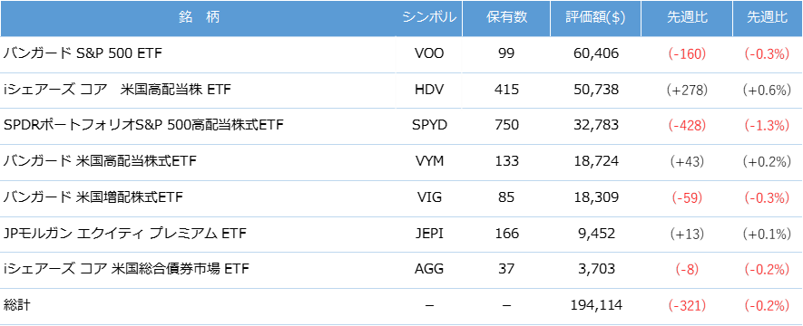 米国株は高配当ETFを中心に安定感のあるETFを購入しています。現在の保有米国株全体の予想配当利回りは、税引前で約3.53%になっています。