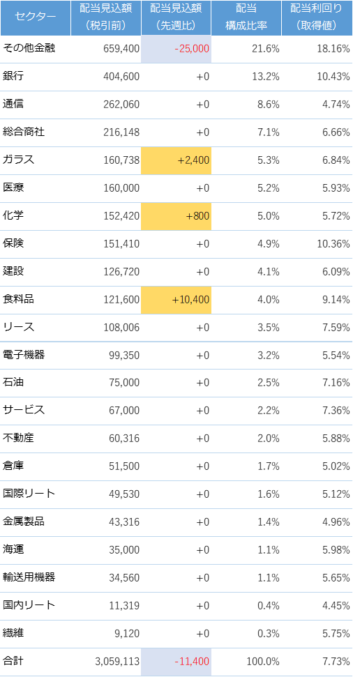 今週は保有株の増減配発表がありました。また、増配発表の適用漏れがありましたので修正しています。そのためセクター別の予想配当構成比率が変更されています。