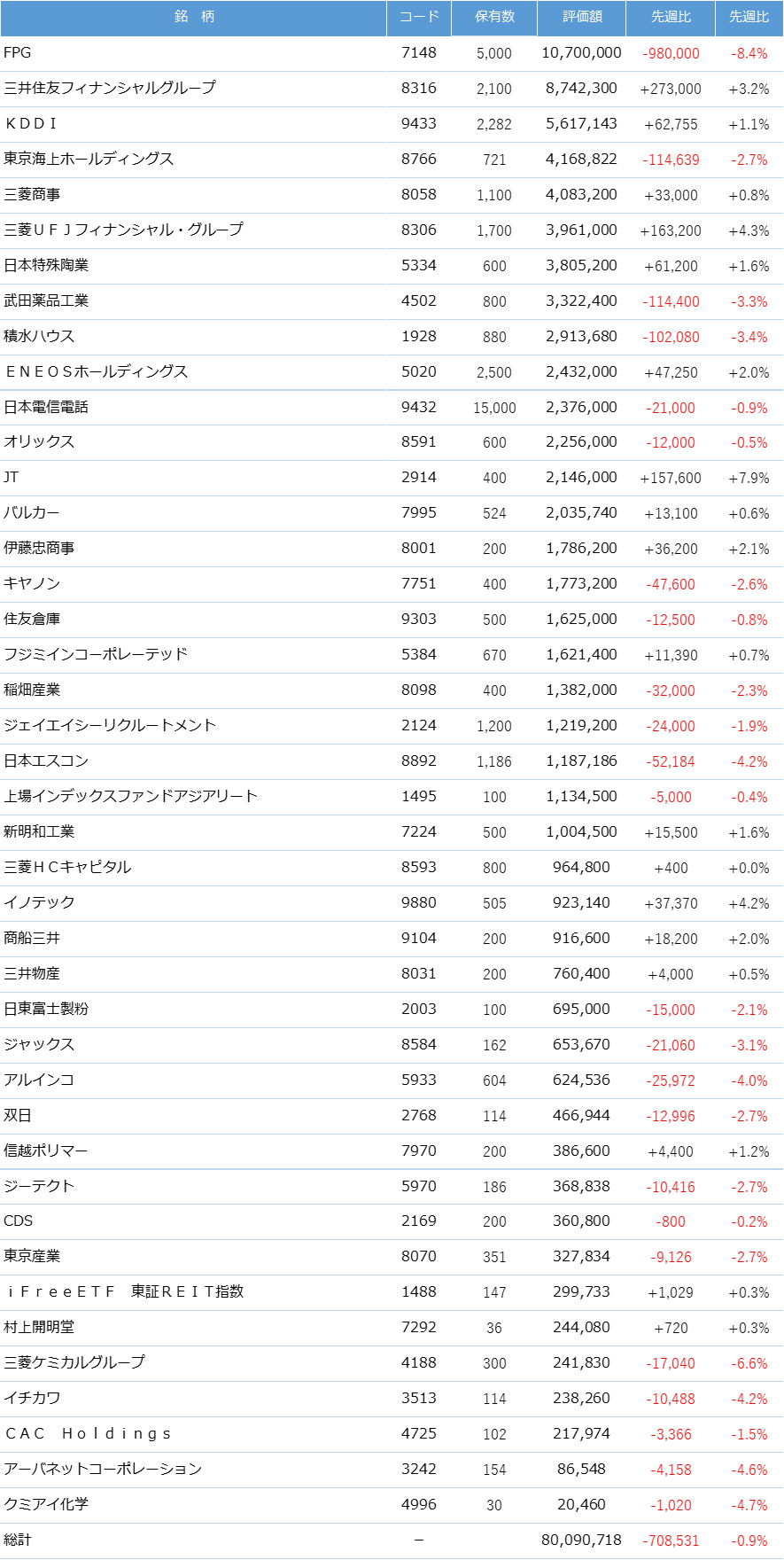 今週は保有する投資信託の基準価額は上昇しましたが、国内株、米国株の株価が下落したため、資産は減少しました。引き続き「高配当株を中心とした長期分散投資」の投資方針を継続していきたいと思います。