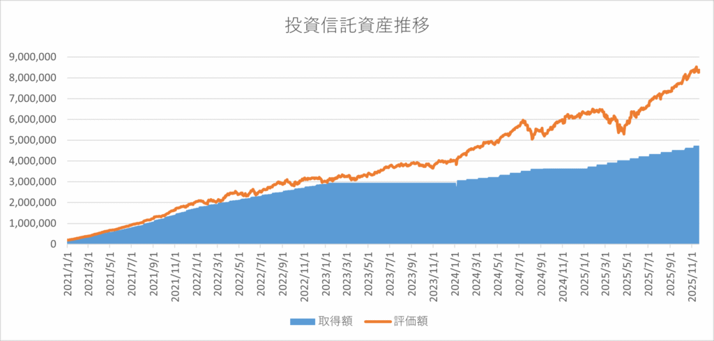 新NISAのつみたて投資枠は、2025年もオルカンを継続し、毎月10万円カード積立を実施しています。