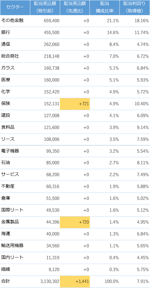 今週は保有株の増配発表がありました。また、下記の国内株を売買しましたので、セクター別の予想配当構成比率が変更されています。