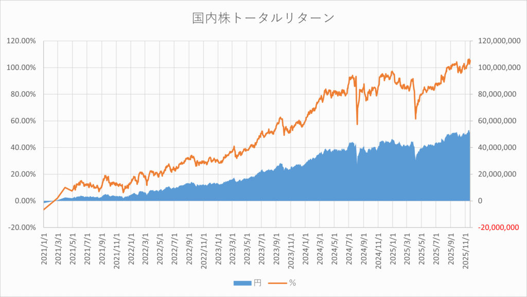 国内株のリターンは先週から低下しました。現時点のリターンは約5,271万円、99.20%になっています。
