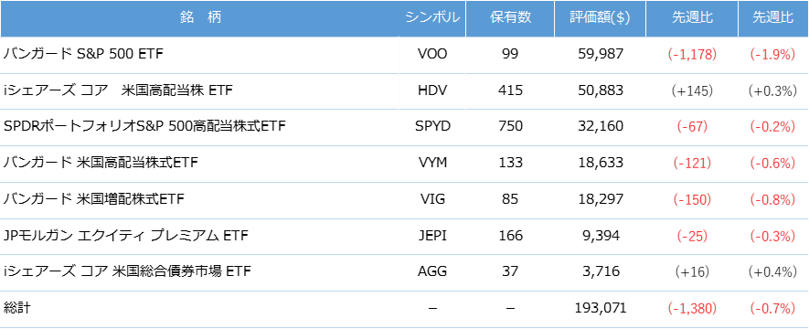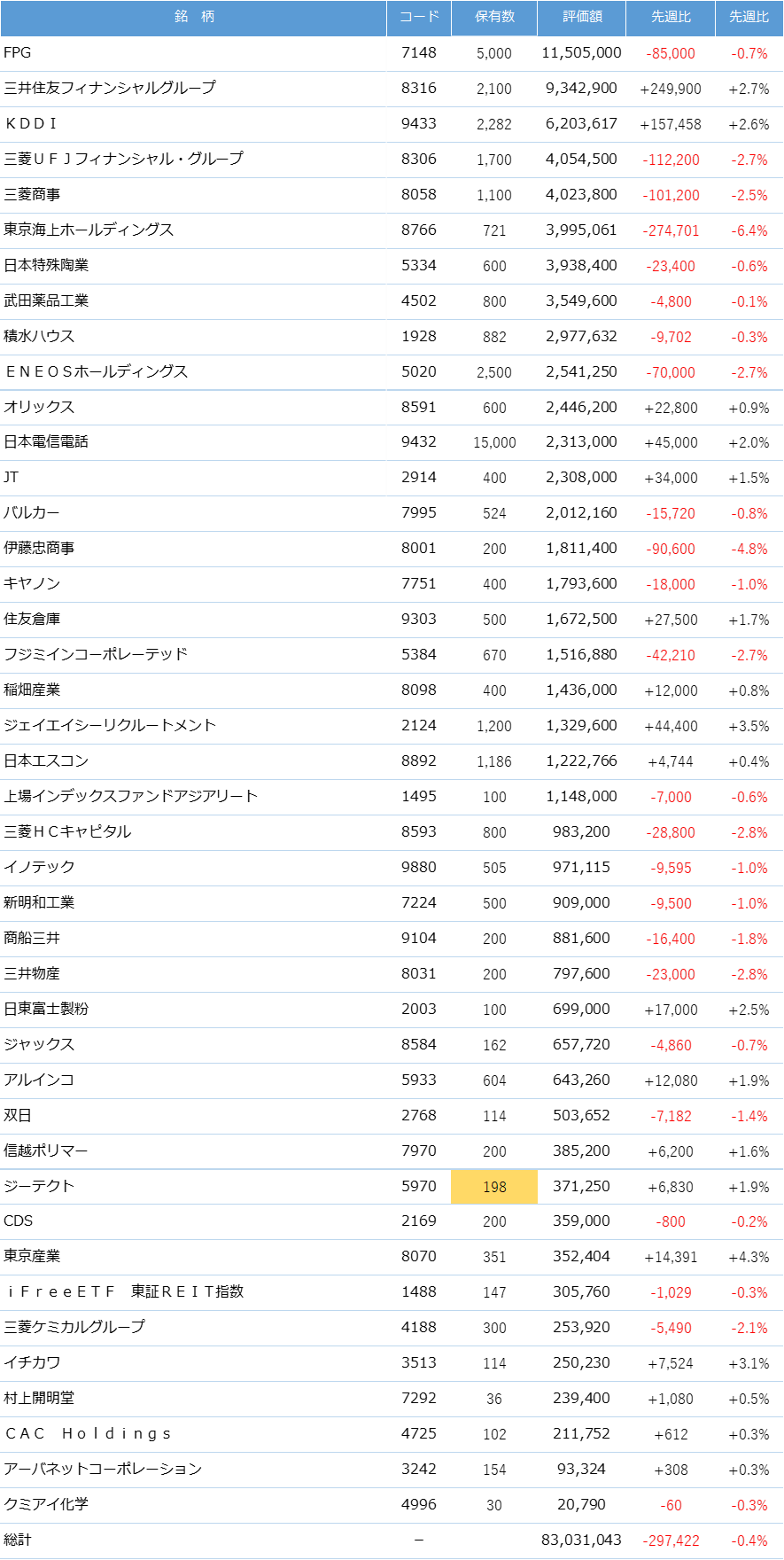 今週は保有する米国株の円換算での株価は上昇しましたが、国内株の株価、投資信託の基準価額が下落したため、資産は減少しました。引き続き「高配当株を中心とした長期分散投資」の投資方針を継続していきたいと思います。
