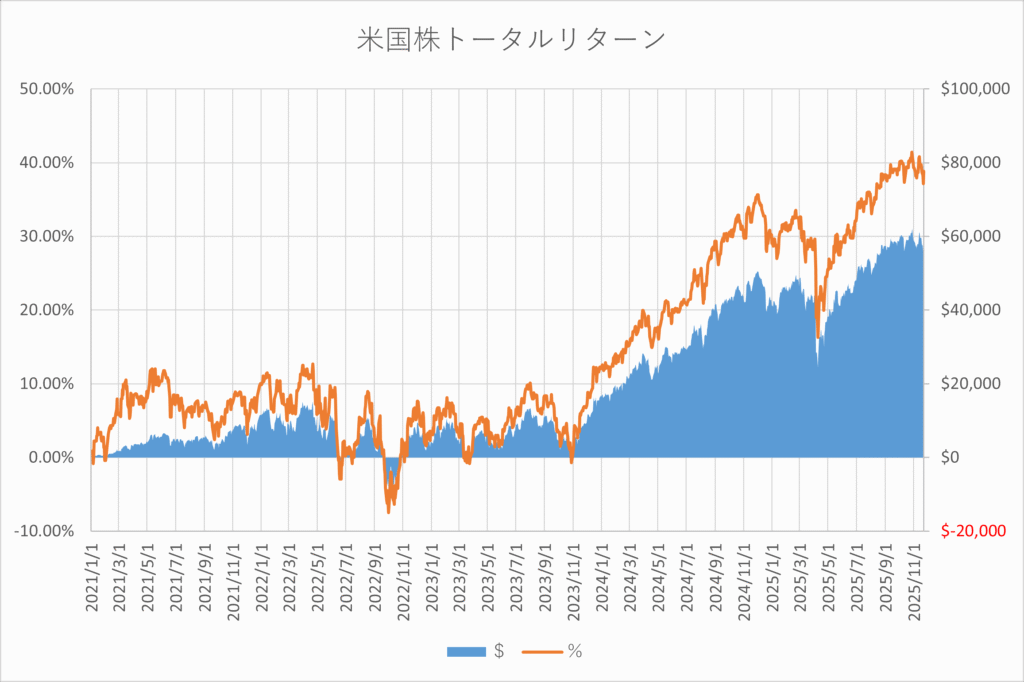 米国株のリターンは先週から低下しました。現時点のリターンは約$58,179、38.82%になっています。
