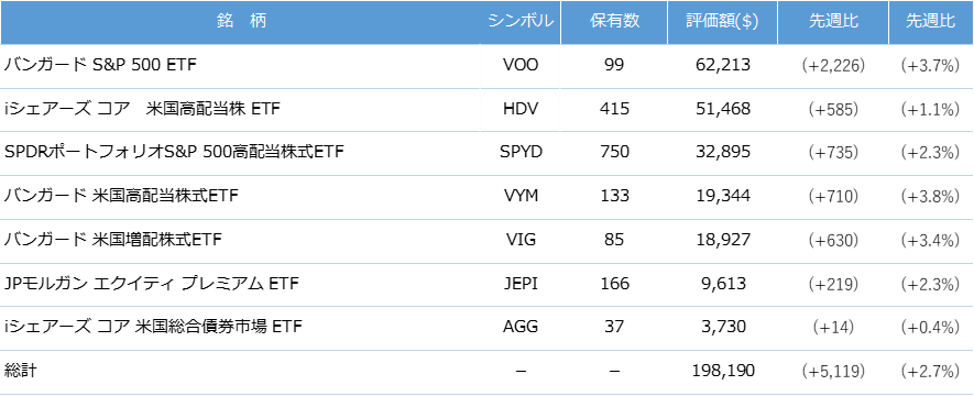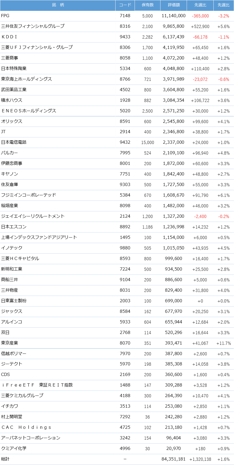 今週は保有する国内株、米国株の株価、投資信託の基準価額が揃って上昇したため、資産は増加し年初来高値を更新しました。引き続き「高配当株を中心とした長期分散投資」の投資方針を継続していきたいと思います。