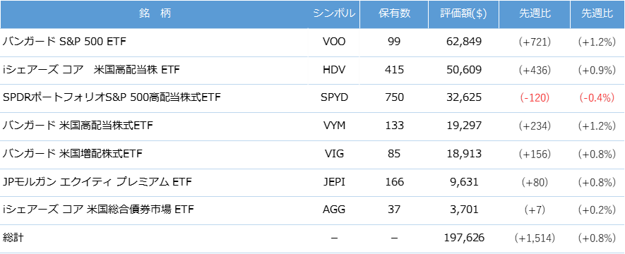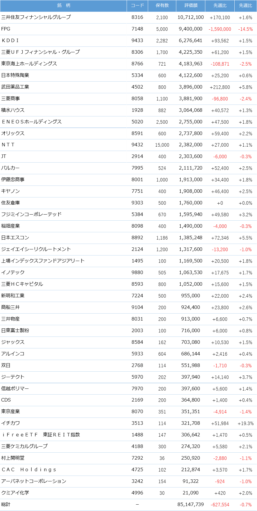 今週は保有する米国株の株価、投資信託の基準価額は上昇しましたが、国内株の株価が下落しため、資産は減少しました。引き続き「高配当株を中心とした長期分散投資」の投資方針を継続していきたいと思います。