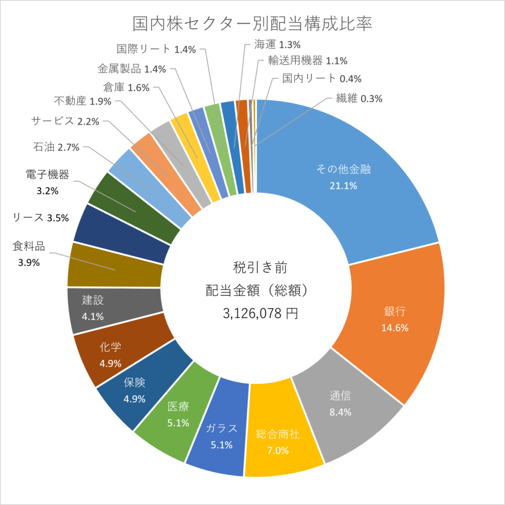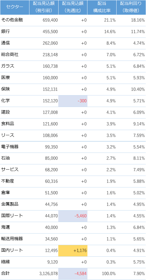 今週はリートETFの分配金を2025年実績ベースで見直しました。また、国内株の減配発表の適用漏れがありましたので修正しています。その結果、セクター別の予想配当構成比率が変更されています。