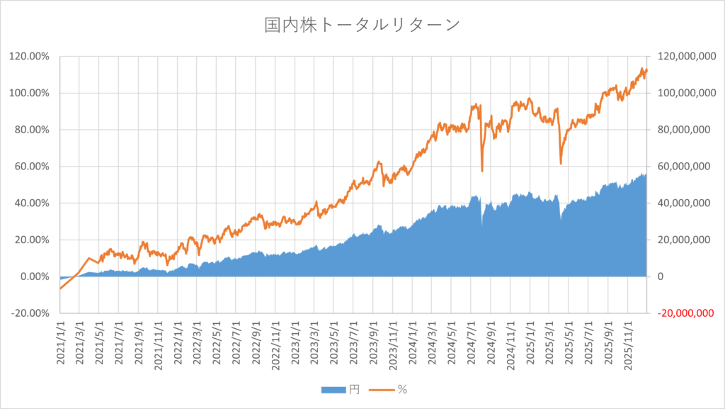 国内株のリターンは先週から上昇しました。現時点のリターンは約5,596万円、105.32%になっています。