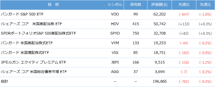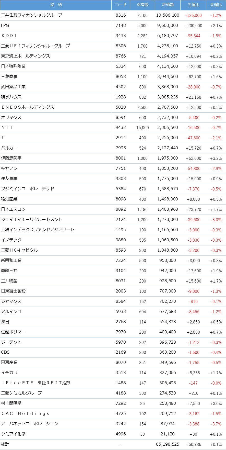 今週は保有する国内株の株価は上昇しましたが、米国株の株価、投資信託の基準価額が下落しため、資産は減少しました。引き続き「高配当株を中心とした長期分散投資」の投資方針を継続していきたいと思います。