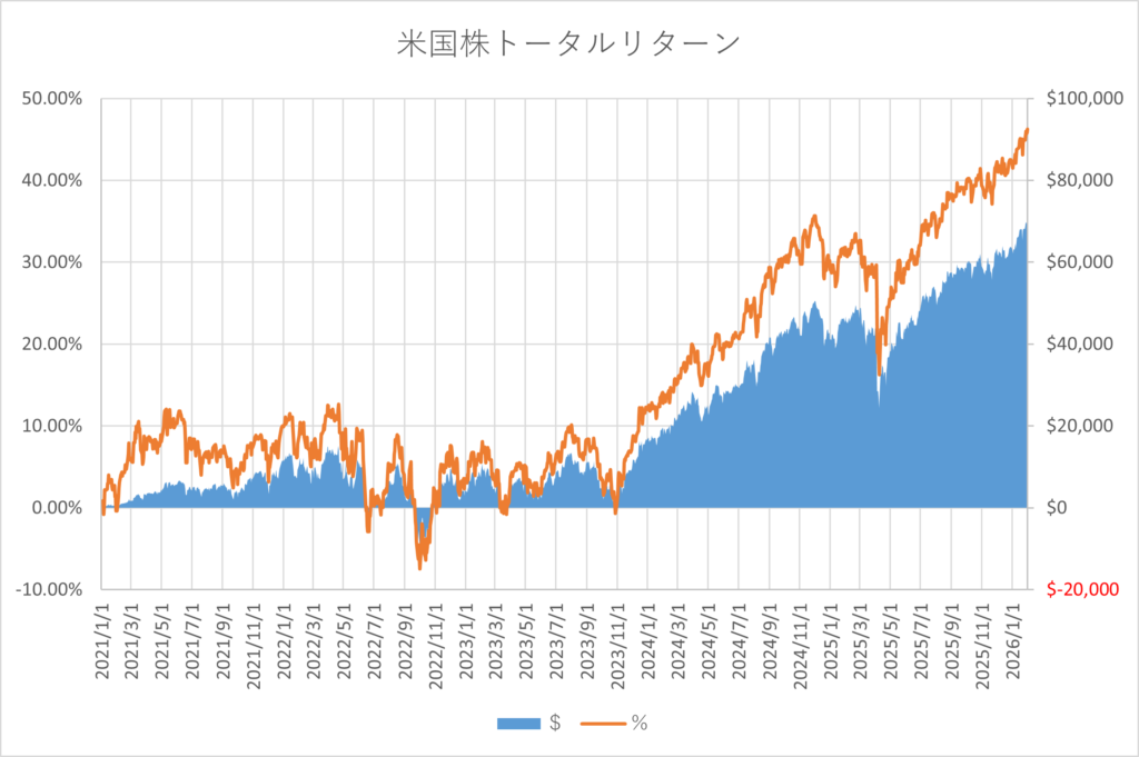 米国株のリターンは先週から上昇しました。現時点のリターンは約$70,529、46.29%になっています。
