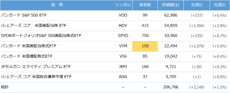 今週は新NISAでVYMを5株追加購入(145株→150株)しました。