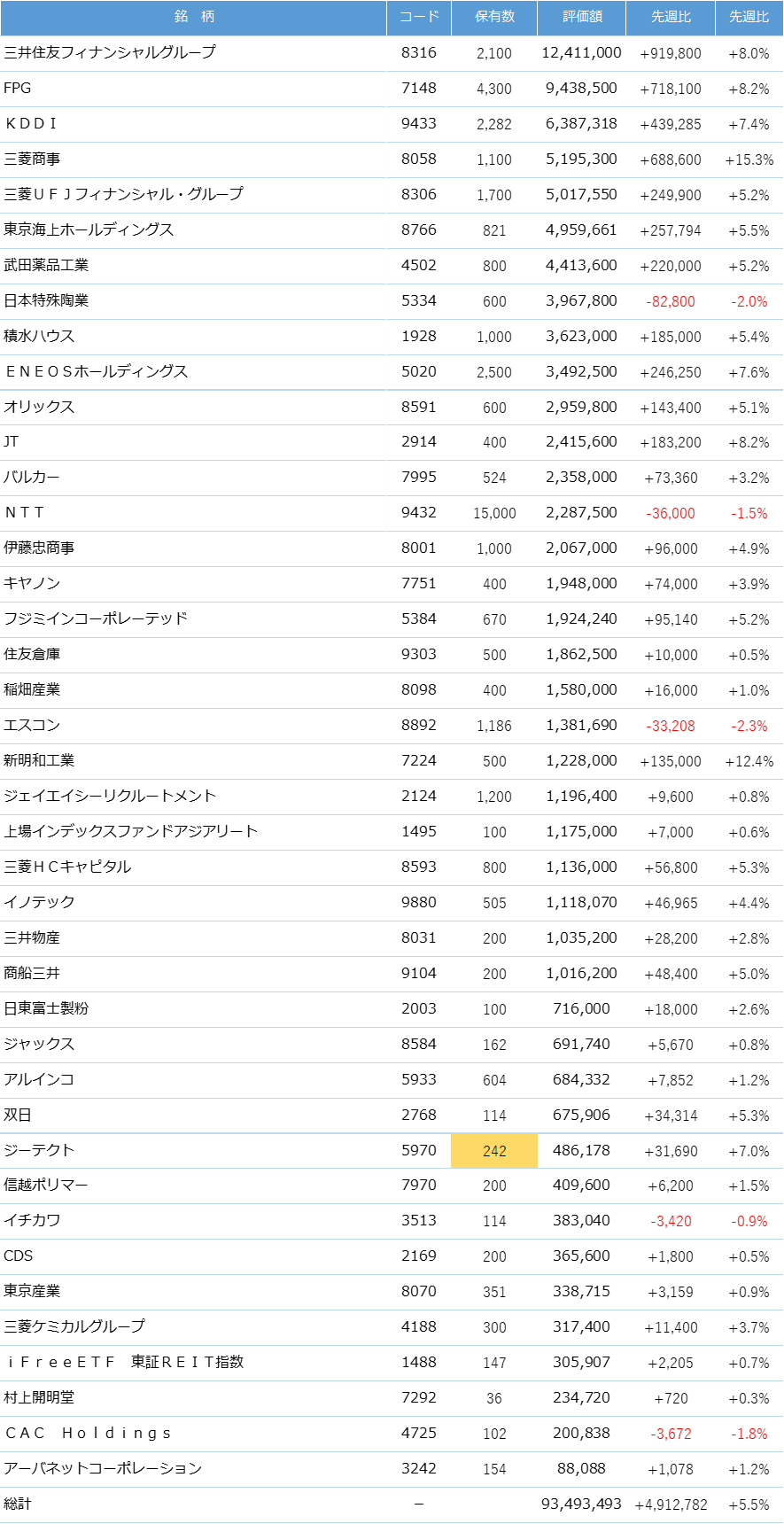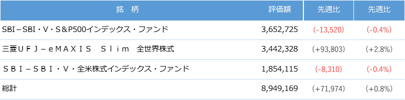 今週は保有する投資信託の基準価額は低下しましたが、国内株、米国株の株価が上昇したため、資産は増加し最高額を更新しました。引き続き「高配当株を中心とした長期分散投資」の投資方針を継続していきたいと思います。