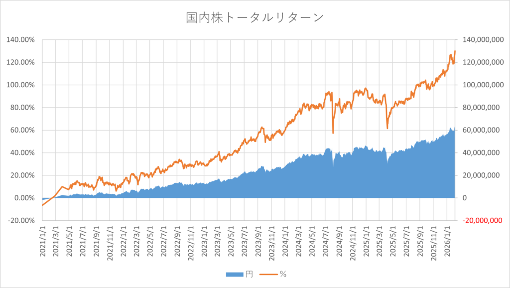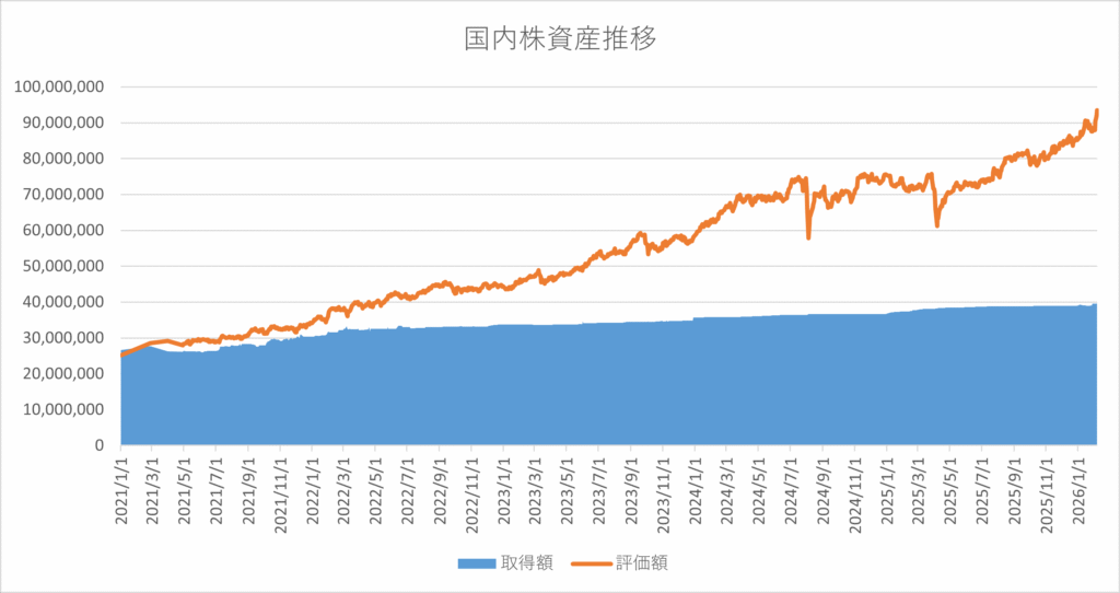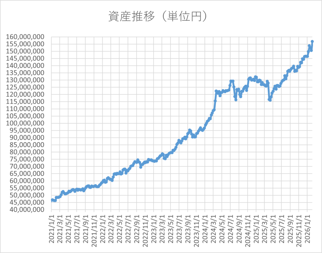 高市さんの発言によってか、為替が一気に円安方向に動き、自民党圧勝の情勢を好感してか、国内株の株価も大きく上昇したため、保有資産は大幅に増加し、最高額を更新しました。