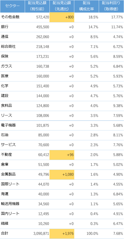 今週は下記の国内株を売買しましたのでセクター別の予想配当構成比率が変更されています。