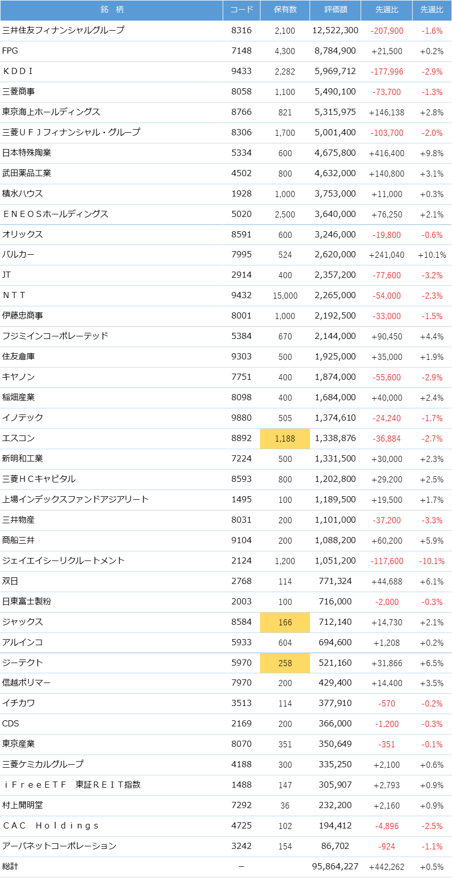 今週は保有する国内株、米国株の株価、投資信託の基準価額が揃って上昇したため、資産は増加し最高額を更新しました。引き続き「高配当株を中心とした長期分散投資」の投資方針を継続していきたいと思います。