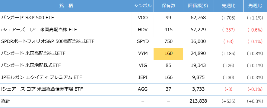 今週は新NISAでVYMを5株追加購入(159株→160株)しました。