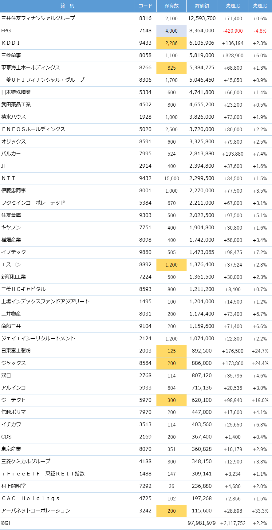 今週は保有する国内株、米国株の株価、投資信託の基準価額が揃って上昇したため、資産は増加し最高額を更新しました。引き続き「高配当株を中心とした長期分散投資」の投資方針を継続していきたいと思います。