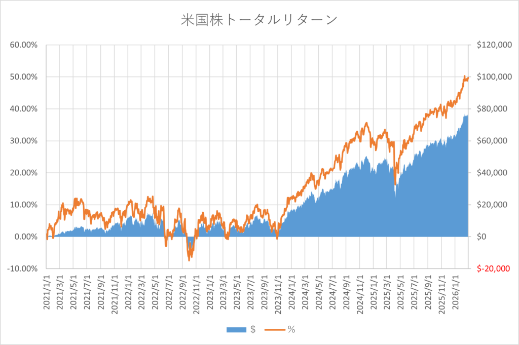 米国株のリターンは先週から上昇しました。現時点のリターンは約$76,754、49.77%になっています。