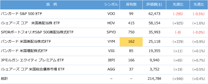 今週は新NISAでVYMを2株追加購入(160株→162株)しました。
