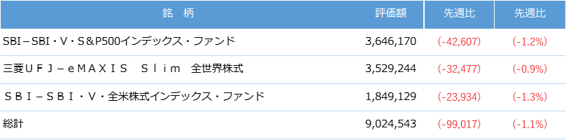 今週は、国内指数、米国指数ともに下落する結果になりました。米国長期金利は上昇、為替は円安になっています。保有する国内株、米国株の株価、投資信託の基準価額が揃って下落したため、資産は大きく減少しました。