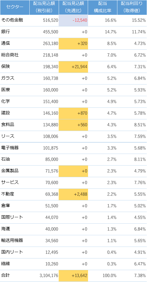 今週は下記の国内株を売買しましたのでセクター別の予想配当構成比率が変更されています。