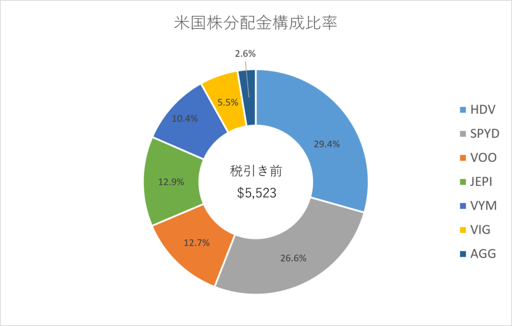 米国株は高配当ETFを中心に安定感のあるETFを購入しています。現在の保有米国株全体の予想配当利回りは、税引前で約3.57%になっています。