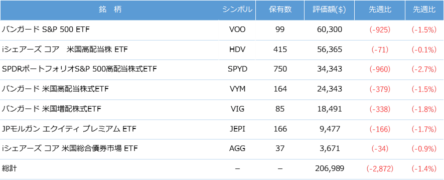 今週は保有する国内株、米国株の株価、投資信託の基準価額が揃って下落したため、資産は大きく減少しました。引き続き「高配当株を中心とした長期分散投資」の投資方針を継続していきたいと思います。