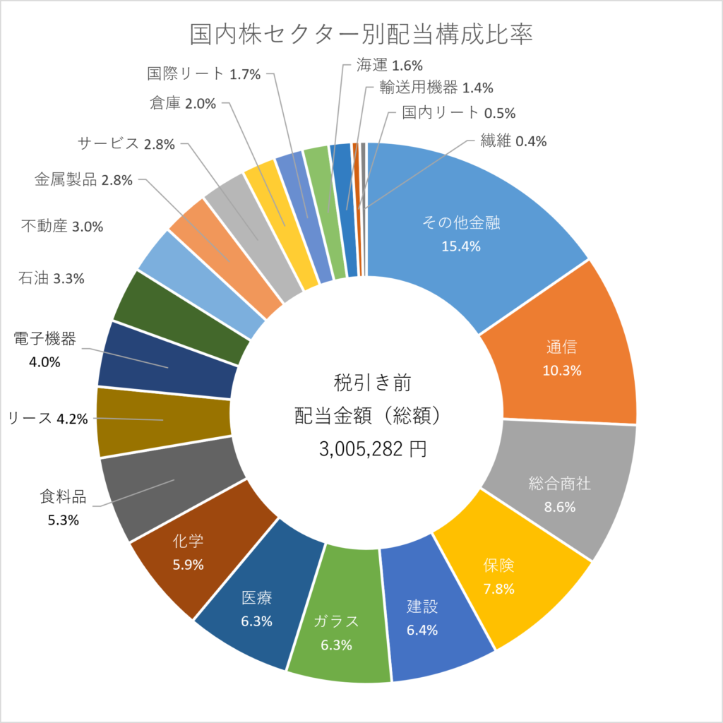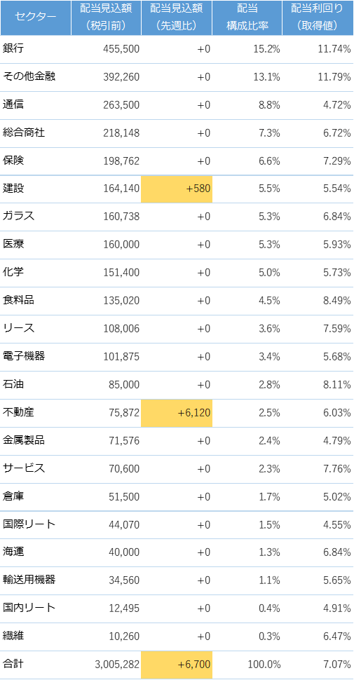 今週は保有株の増配発表がありました。また、下記の国内株を売買しましたのでセクター別の予想配当構成比率が変更されています。