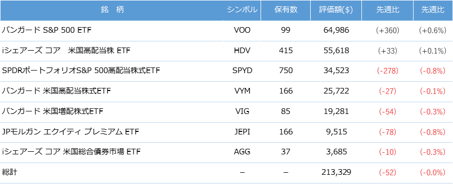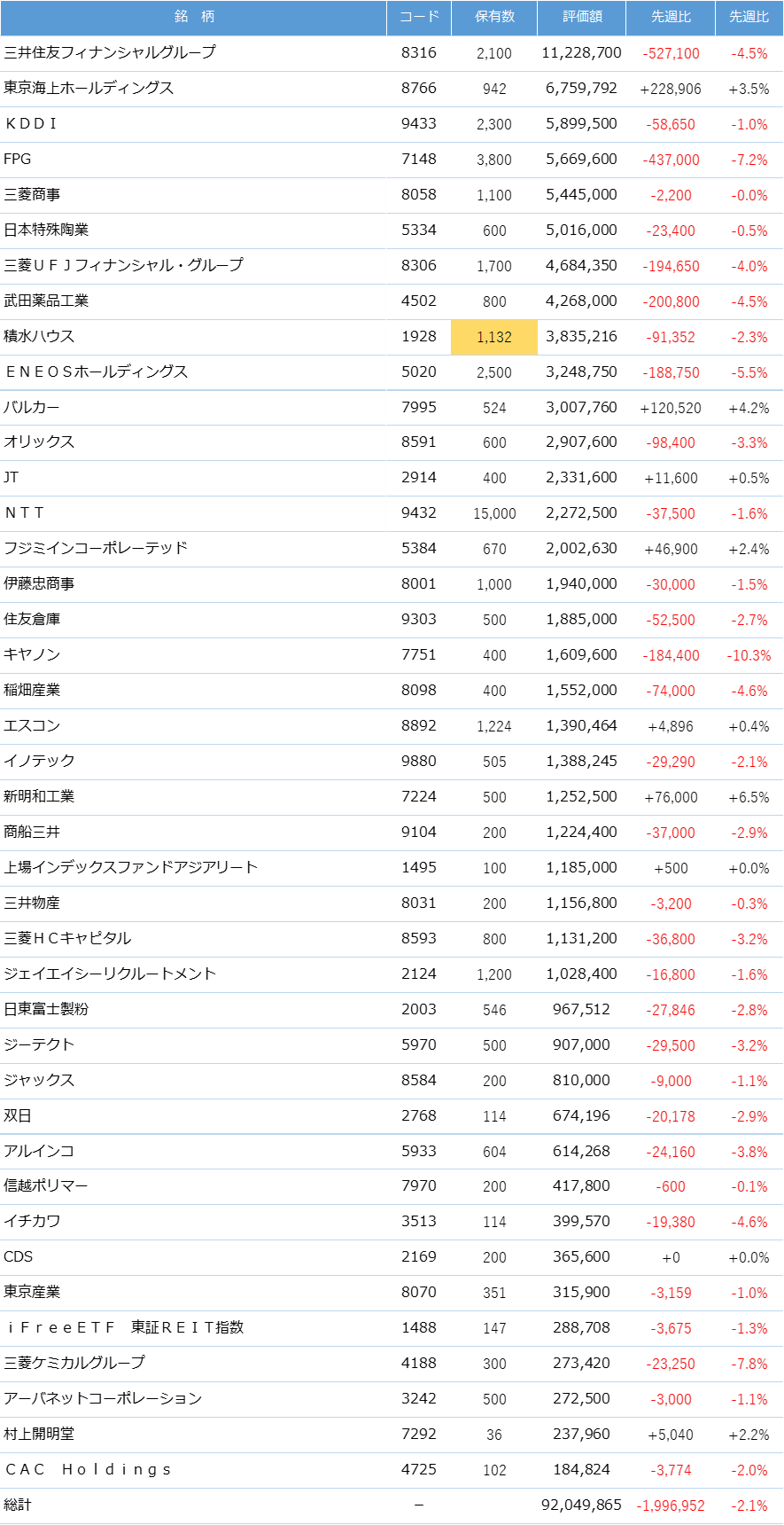 今週は保有する円換算での米国株の株価、投資信託の基準価額は上昇しましたが、国内株の株価が低下したため、資産は減少しました。引き続き「高配当株を中心とした長期分散投資」の投資方針を継続していきたいと思います。
