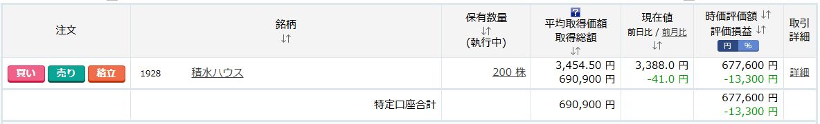 今週も積水ハウスをトレードして利確することができましたが、追加で購入した分が含み損になってしまいました。ただ、取得額自体は問題ないと思っていますので、利益が出るまでじっくり待ちたいと考えています。