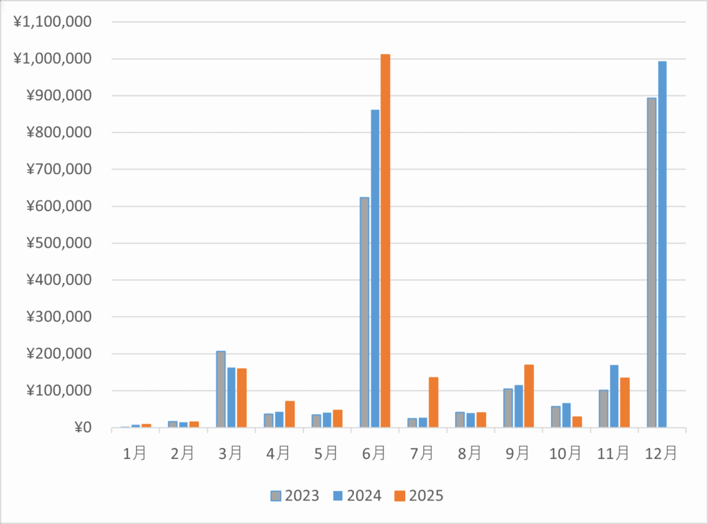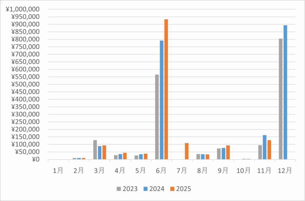 | 月 | 2023年 受領額 (税引き後) | 2024年 受領額 (税引き後) | 2025年 受領額 (税引き後) | 前年同月比 (円) | 前年同月比 (%) |