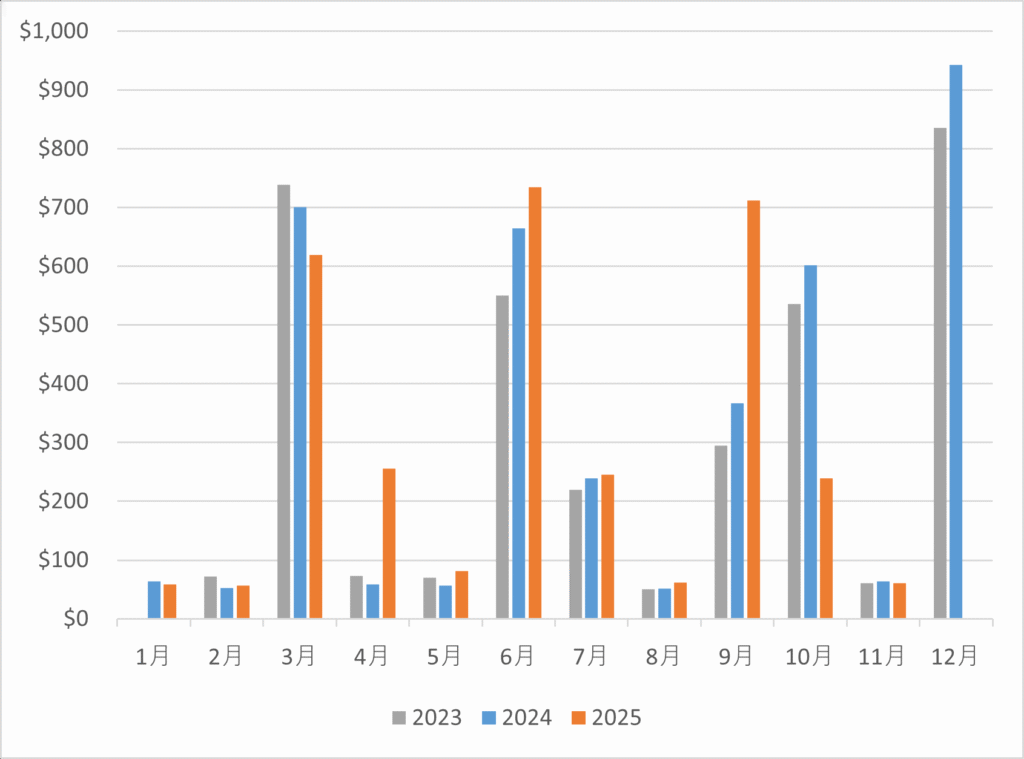 | 月 | 2023年 受領額 (税引き後) | 2024年 受領額 (税引き後) | 2025年 受領額 (税引き後) | 前年同月比 ($) | 前年同月比 (%) |