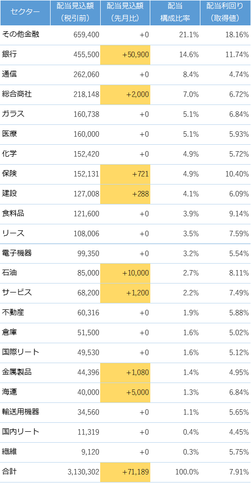11月は保有株の増配発表がありました。また、下記の国内株を売買しましたので、セクター別の予想配当構成比率が変更されています。