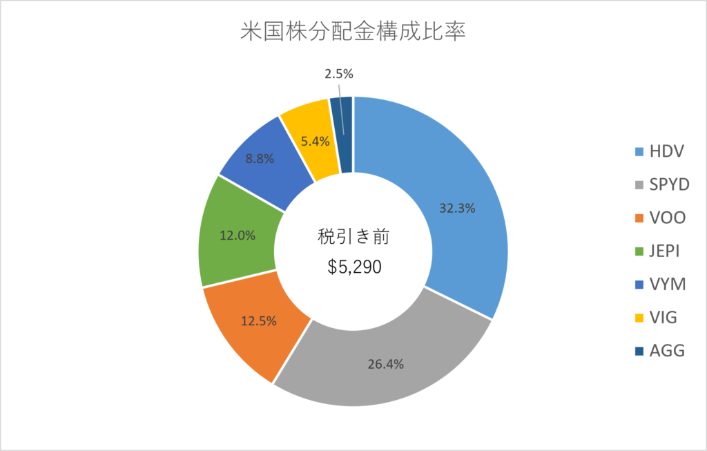 | 銘柄 | 保有数 | 年間予想 分配金$ (税引前) | 分配金 構成比率 (%) | 利回り [取得値] (%) |