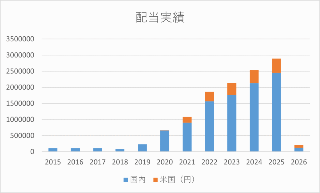 2026年3月は185,054円の配当実績でした。2026年累計は211,031円です。