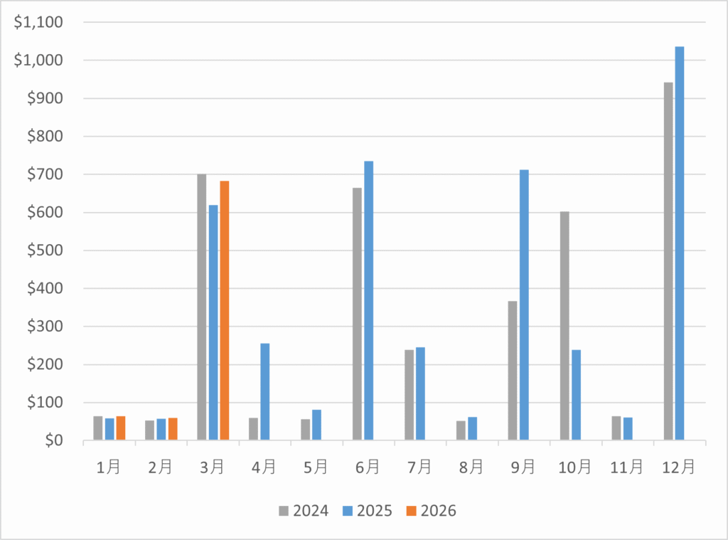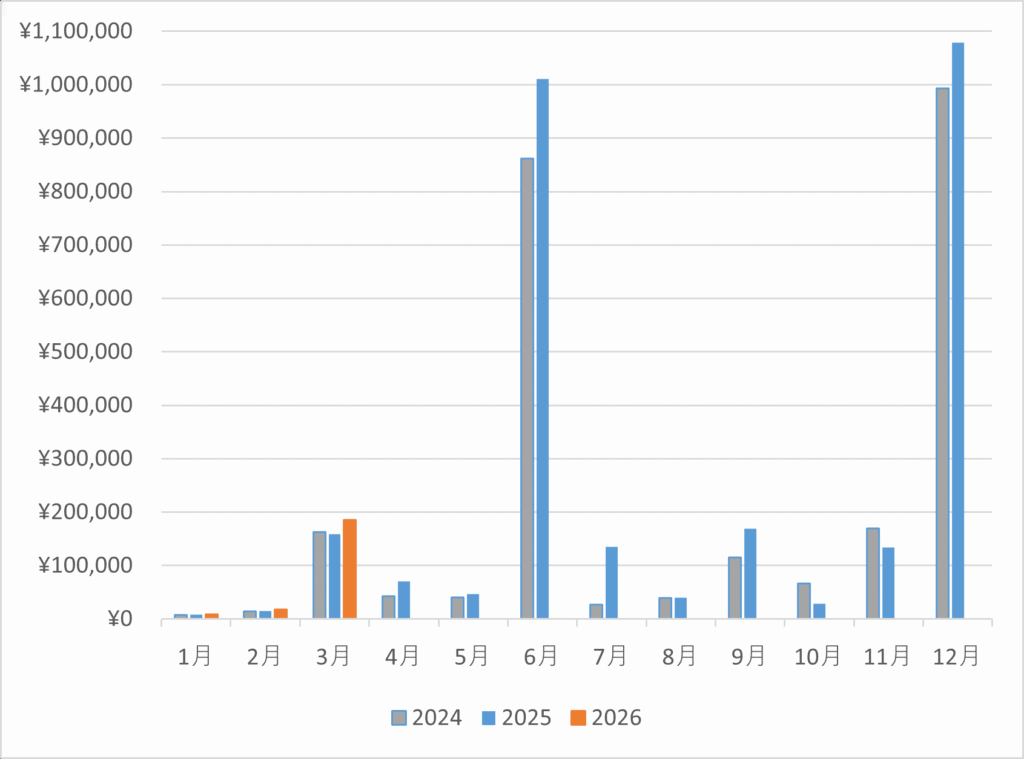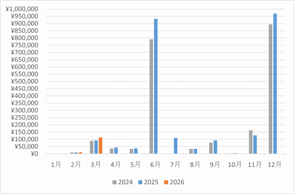 ※表中合計欄の2024年、2025年は2026年同時期までの合計額を上段に記載し、年間の合計額を下段に()で記載しています。