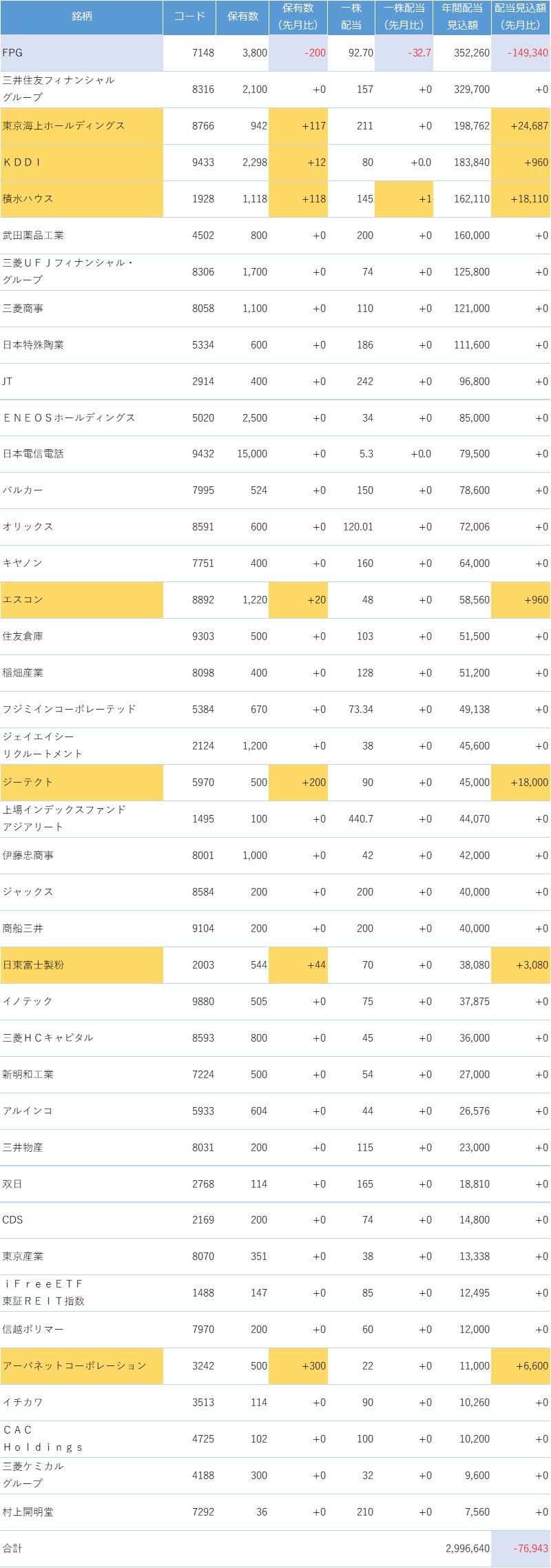 3月は積水ハウスが増配を発表してくれましたが、残念ながらFPGが大幅減配を発表した結果、年間配当見込額が大きく減少しました。