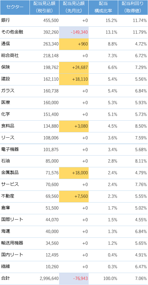 3月は保有株の増減配発表がありました。また、下記の国内株を売買しましたので、セクター別の予想配当構成比率が変更されています。